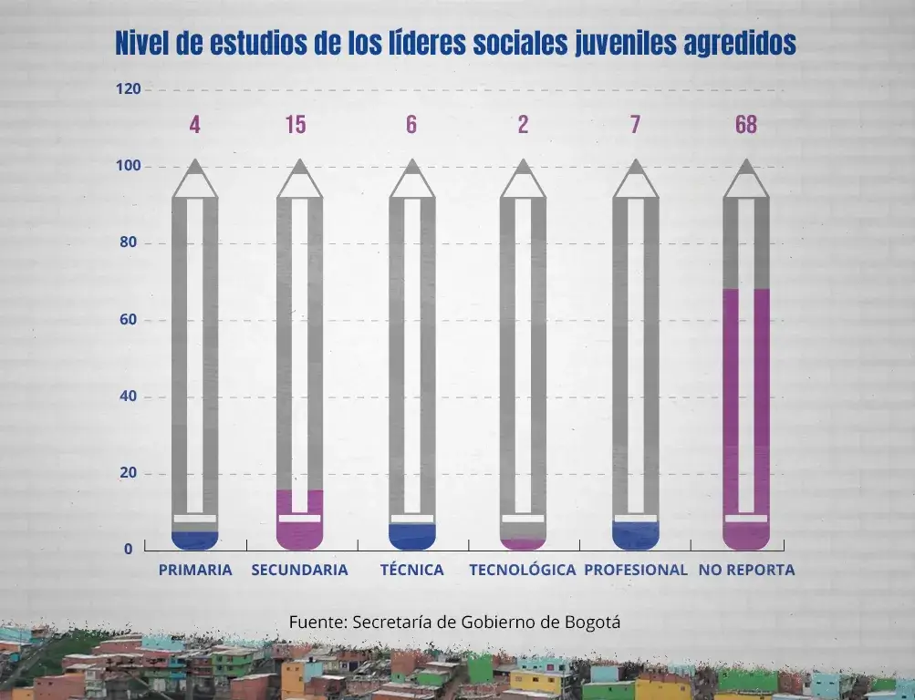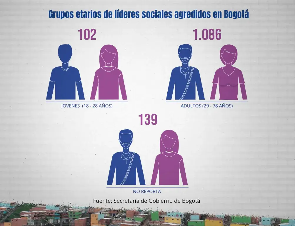 Según el consolidado de la Secretaría de Gobierno, desde octubre de 2012 hasta el 20 de diciembre de 2019, se han presentado un total de 104 amenazas, asedios, asesinatos y otros delitos similares contra líderes sociales juveniles en la capital. Las localidades más afectadas son Ciudad Bolívar (14), Usme (14) y Rafael Uribe Uribe (12).